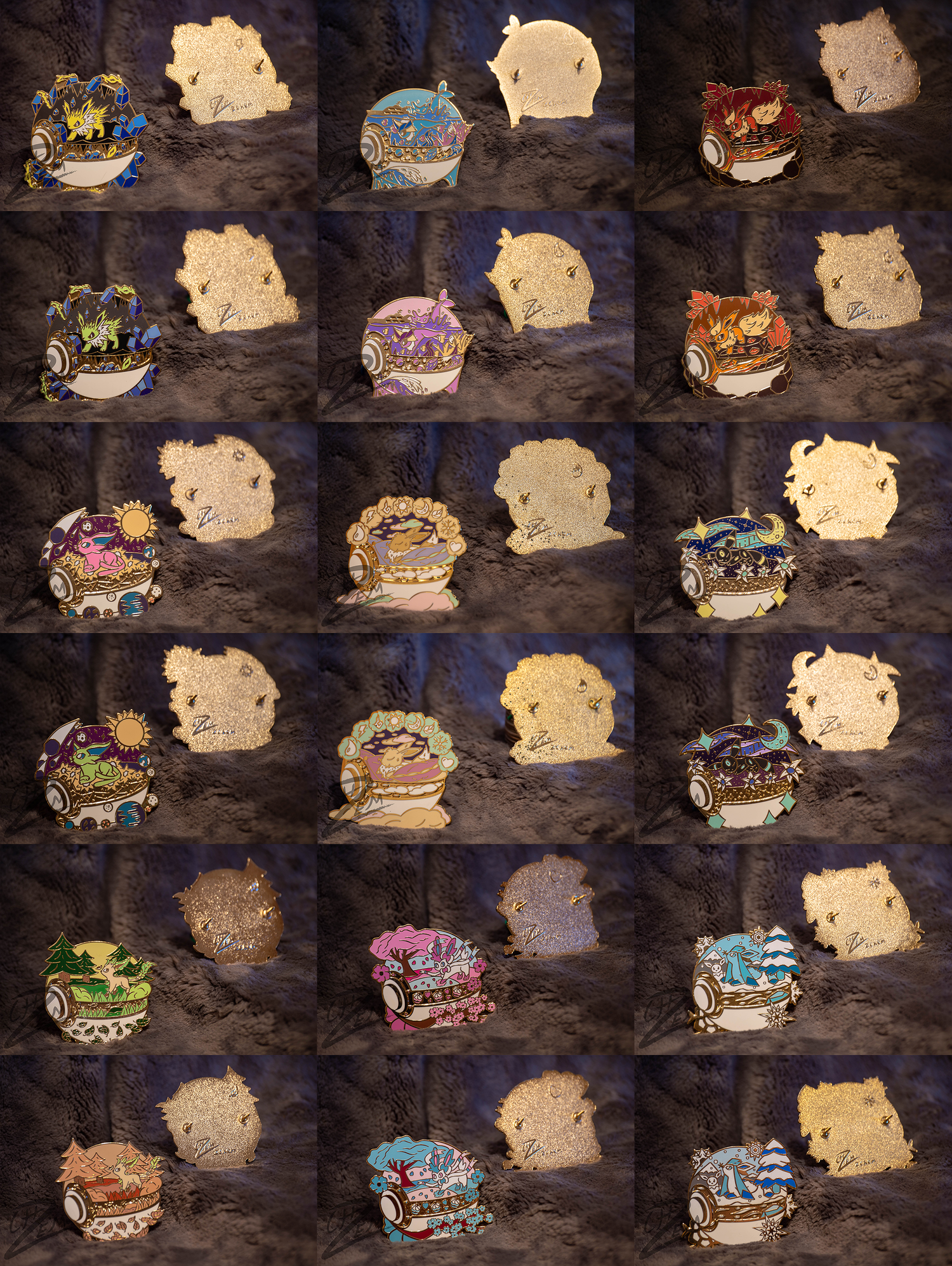 Pins are what I got started with when making merch! I've made over 40 designs, the most popular of which have easily been my eeveelutions seen here!